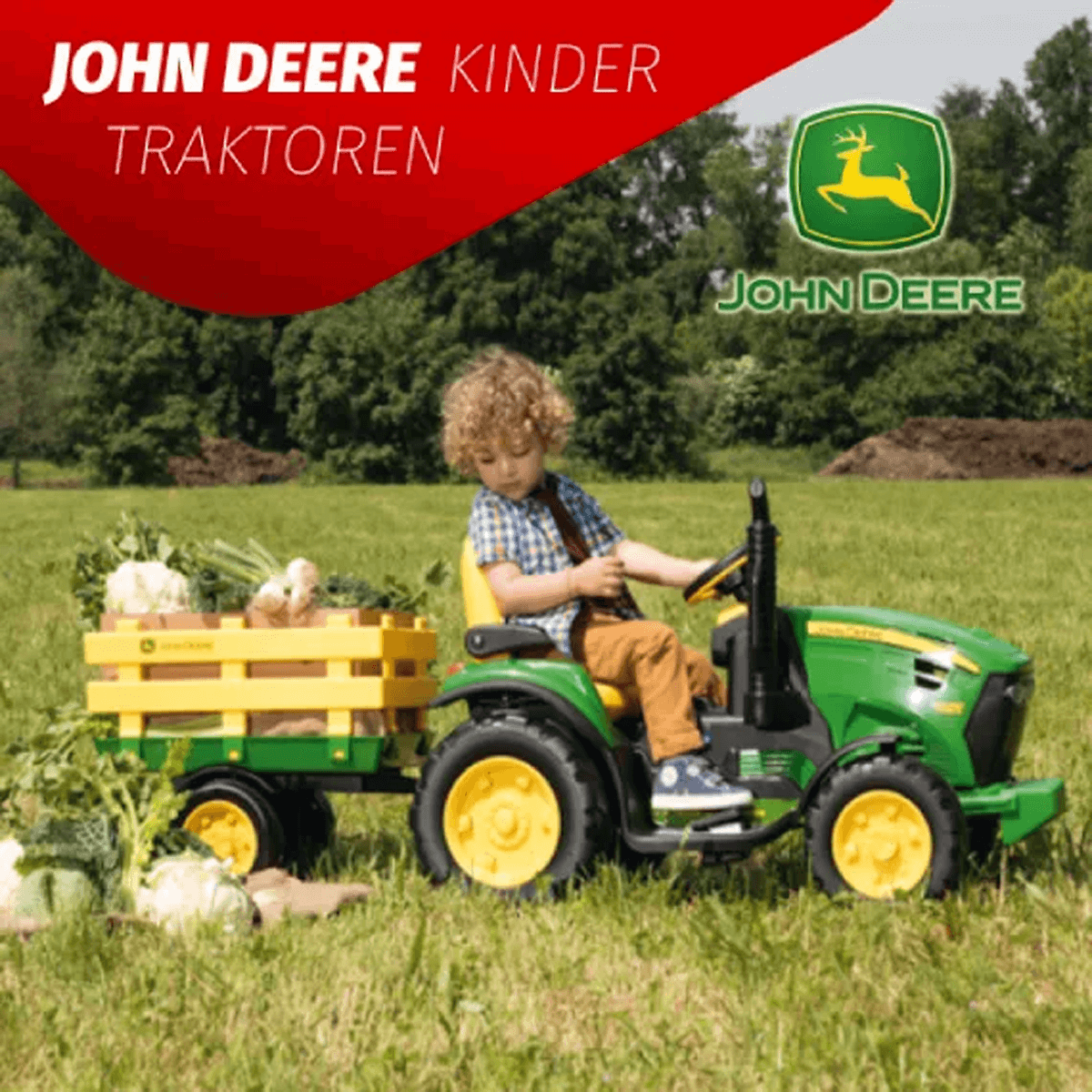 Einfach zu fahren, gestattet der neue John Deere Dual Force mit aufladbarer Batterie große Manöver bei höchster SicherheitKomplett mit Platz für 2 Kids erheitert er das Landleben der kleinen Farmer von heute. Qualität vom bekannten europäischen Hersteller PEG PEREGO. Ein italienisches Unternehmen mit globaler Vision. Seit über 60 Jahren stellt PEG PEREGO in Italien mit besonderer Leidenschaft eine große Vielfalt an Produkten für Kinder und Eltern her, die auf unsere Werte setzen: Erfahrung, Qualität und Sicherheit. PEG PEREGO bietet einen umfassenden Kundendienst, eine stets aktualisierte Internetseite und ein innovatives Service-Portal. Im Gegensatz zu Billig-Importen aus Fernost bekommen Sie für dieses qualitativ hochwertige Produkt auch noch nach Jahren Original Ersatzteile. Sie werden jahrelang Freude an dem Fahrzeug haben -es gibt kaum Reklamationen - die TOP-Qualität aus Europa ist mit Billig-Produkten nicht vergleichbar. Leistungsstark, robust, sicher und wie ein echter Traktor. Der John Deere Dual Force gefällt allen Kindern aufgrund seiner beeindruckenden Größe und der Möglichkeit, den besten Freund oder Freundin mitzunehmen. Oder das kleine Geschwisterchen.Ein Bordcomputer mit FM-Radio und USB Port und Batteriestandsanzeige sind selbstverständlich. Die wuchtige Motorhaube und das große Frontgewicht verleihen dem Traktor sein starkes Aussehen. Zwei je 240 Watt Motoren an der Hinterachse liefern eine Gesamtleistung von gewaltigen 480 Watt. Damit fährt der Traktor auch zu zweit durch unwegsames Gelände. Ein wirklich starker Begleiter! Der John Deere Dual Force hat alles, was man für eine sichere und bequeme Unterhaltung Ihres Kindes braucht. Die in zwei Positionen verstellbaren Sitze können an die Fahrer angepasst werden. Er lässt sich super leicht fahren! Auf der rechten Seite befindet sich das Gaspedal das, wenn es losgelassen wird, zur Bremse wird und den Traktor automatisch anhält. Über den Schalthebel lassen sich zwei Geschwindigkeiten und der Rückwärtsgang einstellen. Die zweite, höhere Geschwindigkeit kann blockiert werden, wenn der kleine Fahrer noch unsicher ist. Bis zu 10% Steigung kann der Traktor leicht bewältigen. Ein großer passender Anhänger ist separat erhältlich. Qualität und Sicherheit aus dem Hause Peg Perego! Die Qualität der Produkte von Peg Perego ist an den Einzelheiten zu erkennen, die die Sicherheit garantieren. Der John Deere Dual Force hat einen geschlossenen Unterboden, um den Fahrer vor Stromkabeln und eventuellen Verletzungen zu schützen und Spritzwasser, Matsch und Sand vom Fahrzeug fern zu halten. Die 12V/12Ah-Batterie unter der Motorhaube ist durch eine Kindersicherung vor unbefugten Eingriffen geschützt. Die Batterie kann mit Hilfe einer normalen Haushaltssteckdose direkt vom Fahrzeug aus oder nach dem Entnehmen aufgeladen werden. Batterieladegerät und Batterie sind im Lieferumfang enthalten. Technische Details: 2 Vorwärtsgänge, ca. 3,5 km/h bzw. ca. 7,5 km/h 1 Rückwärtsgang, ca. 3,4 km/h 1 Pedal für Gas und Bremse, wird der Fuß vom Pedal genommen, stoppt der Traktor automatisch Antrieb an beiden Hinterrädern durch zwei 240 Watt Motoren verstellbare SitzeHupe, Getränkehalter, Batteriestandsanzeige geschlossene Karrosserie FM-Radio mit USB Port fährt bis zu 10% Steigunginklusive Ladegerät und wiederaufladbarem Akku 12V/12AH Maße (LxBxH): 152 x 86 x 94 cm