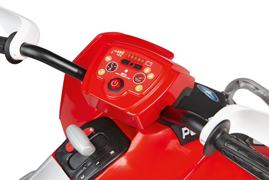Qualität und Sicherheit aus dem Hause Peg Perego. Die Qualität der Produkte von Peg Perego ist an den Einzelheiten zu erkennen, die die Sicherheit garantieren. Das Polaris Outlaw hat einen geschlossenen Unterboden, um den Fahrer vor Stromkabeln und eventuellen Verletzungen zu schützen und Spritzwasser, Matsch und Sand vom Fahrzeug fern zu halten.