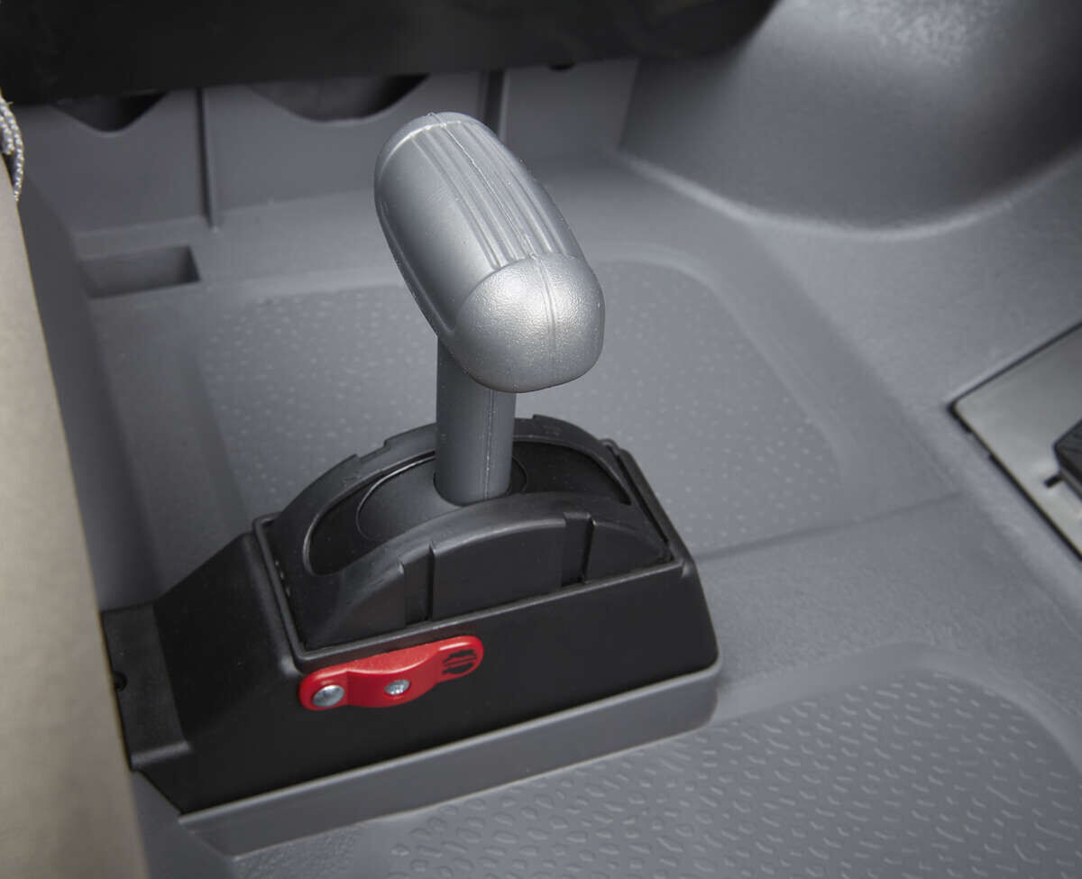 Der Schalthebel bietet 2 Vorwärtsgänge mit 6 km/h und 12 km/h und einen Rückwärtsgang. Der zweite Gang kann mechanisch gesperrt werden, bis das Kind den Jeep voll im Griff hat.