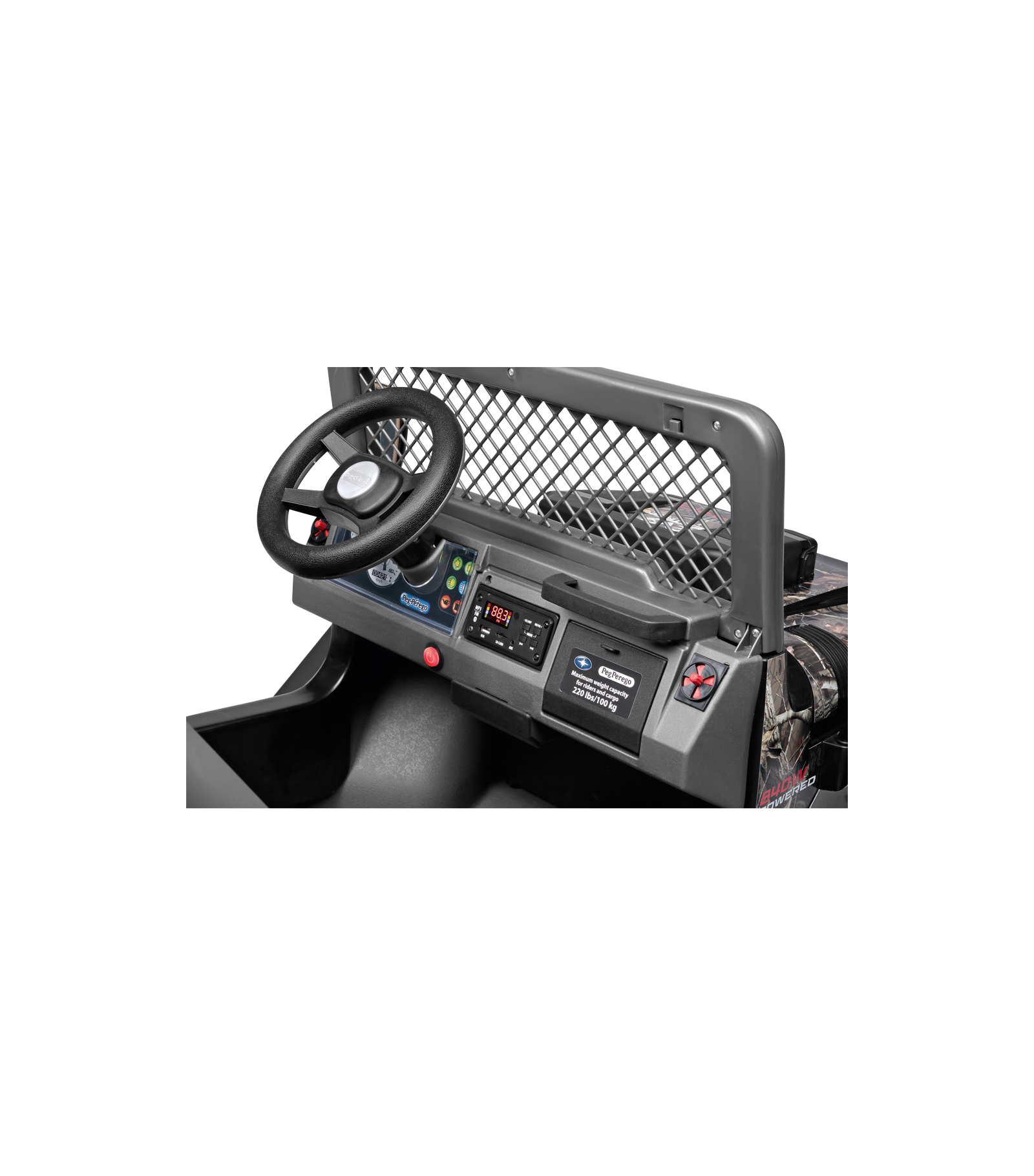Das Armaturenbrett ist mit einem Startknopf, einer Hupe und einem UKW-Radio mit MP3-Eingang und USB-Anschluss (Player und Stick nicht im Lieferumfang enthalten) ausgestattet.