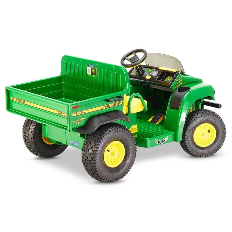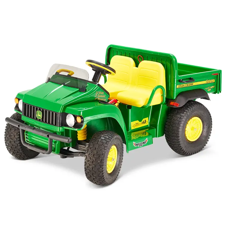 NEU - im Gator ist ab sofort ein Lithiumbatterie verbaut. Das erhöht zwar den Preis geringfügig, die Laufzeit pro Ladung ist aber deutlich länger als mit den herkömmlichen Bleibatterien!Akkulaufzeit pro Ladung: ca. 90 MinutenAlles ist mit einem Freund an der Seite leichter. Ein detailgetreuer Nachbau des John Deere Gator HPX im bekannten gelb-grün. Eines der ersten Modelle von Peg Perego aus der großen John Deere-Produktfamilie, das den HPX des berühmten amerikanischen Herstellers detailgetreu reproduziert. Der John Deere Gator HPX gefällt allen Kindern ab drei Jahren, die sich gerne in unglaubliche Abenteuer stürzen. Der Gator HPX fährt selbst auf unwegsamem Gelände und schafft Steigungen bis zu 17 %. NEU - der Gator kann auch mit einer speziell für dieses Fahrzeug entwickelten Luftbereifung ausgestattet werden, bzw. kann diese jederzeit und einfach nachgerüstet werden. Die Luftbereifung verringert das Fahrgeräusch und erhöht die Traktion der Reifen enorm. Qualität vom bekannten europäischen Hersteller PEG PEREGO. Ein italienisches Unternehmen mit globaler Vision. Seit über 60 Jahren stellt PEG PEREGO in Italien mit besonderer Leidenschaft eine große Vielfalt an Produkten für Kinder und Eltern her, die auf unsere Werte setzen: Erfahrung, Qualität und Sicherheit. PEG PEREGO bietet einen umfassenden Kundendienst, eine stets aktualisierte Internetseite und ein innovatives Service-Portal. Im Gegensatz zu Billig-Importen aus Fernost bekommen Sie für dieses qualitativ hochwertige Produkt auch noch nach Jahren Original Ersatzteile. Sie werden jahrelang Freude an dem Fahrzeug haben -es gibt kaum Reklamationen - die TOP-Qualität aus Europa ist mit Billig-Produkten nicht vergleichbar. Wie schön ist es, herumzufahren, zu spielen und abzuladen! Der John Deere Gator HPX ist wie dafür geschaffen, in absoluter Sicherheit auf der Wiese spazieren zu fahren. Fährt sicher auf Grasboden und kann sich mit seinen 12 Volt mit Kraft und Wendigkeit selbst auf schwierigsten Strecken durchsetzen. Seine zwei Sitze garantieren viele Stunden Spielvergnügen zu zweit. Er verfügt über eine riesige, kippbare Ladefläche, die auch im Sitzen zum Abladen hochgefahren werden kann. Die Ladefläche, die bis zu 10 kg transportieren kann, hat eine Klappe, die sich öffnen lässt und Seitengriffe zum einfachen Be- und Entladen. Der John Deere Gator HPX wird für lange Zeit der beste Spielkamerad Ihres Kindes sein. Wenn es größer wird, kann die Ladefläche (in zwei Positionen verstellbar) verschoben und der Sitz kann nach hinten geschoben werden, um mehr Platz für die Beine zu erhalten. Der John Deere Gator HPX lässt sich besonders leicht fahren. Das Gaspedal wird, wenn es losgelassen wird, automatisch zur Bremse, sodass das Fahrzeug sanft und ohne Rucken angehalten werden kann. Über den Schalthebel lassen sich zwei Geschwindigkeiten und der Rückwärtsgang einstellen. Die zweite, höhere Geschwindigkeit kann blockiert werden, wenn der kleine Fahrer noch unsicher ist. Der Sitz ist breit genug und kann in der Länge in vier Positionen an die Größe jedes Fahrers angepasst werden. Daran befinden sich zwei Armstützen für eine bequeme und sichere Fahrt, an denen man sich auf holprigen Strecken festhalten kann. Und wenn die Fahrt noch wüster wird, kann sich der Beifahrer zusätzlich an einem Griff am Armaturenbrett festhalten und der Fahrer am robusten Lenkrad. Um sich den Weg frei zu machen, reicht die Hupe! Der John Deere Gator HPX wird durch seine speziellen Details zu etwas Besonderem. Die großen Frontscheinwerfer reflektieren das Licht, sodass es so aussieht, als wären sie eingeschaltet. Die breite vordere Stoßstange schützt den Geländewagen und das Batteriefach bei frontalen Zusammenstößen. Über den großen, vorderen Kotflügeln befinden sich zwei Getränkehalter oder Fächer, um alles Wichtige immer griffbereit zu haben. Über den Schlüssel am Armaturenbrett kann der Motor im Spiel angelassen werden. Vier große dekorative Stoßdämpfer und das große John Deere-Logo auf dem Kühler runden das Äußere ab. Als Anhänger kann der (separat erhältliche) John Deere Adventure Trailer angehängt werden. Qualität und Sicherheit aus dem Hause Peg Perego. Die Qualität der Produkte von Peg Perego ist an den Einzelheiten zu erkennen, die die Sicherheit garantieren. Der John Deere Gator HPX hat einen geschlossenen Unterboden, um den Fahrer vor Stromkabeln und eventuellen Verletzungen zu schützen und Spritzwasser, Matsch und Sand vom Fahrzeug fern zu halten. Die 12V/12Ah-Batterie unter der Motorhaube ist durch eine Kindersicherung vor unbefugten Eingriffen geschützt. Die Batterie kann mit Hilfe einer normalen Haushaltssteckdose direkt vom Fahrzeug aus oder nach dem Entnehmen aufgeladen werden.Batterieladegerät und Batterie sind im Lieferumfang enthalten. Technische Details: 2 Vorwärtsgänge, ca. 3,5 km/h bzw. ca. 7 km/h 1 Rückwärtsgang, ca. 3,2 km/h große Profilreifen aus Kunststoff, Luftbereifung separat erhältlich 1 Pedal für Gas und Bremse, wird der Fuß vom Pedal genommen, stoppt der Gator automatisch Antrieb an beiden Hinterrädern durch zwei 175 Watt Motoren übersichtliches Armaturenbrett Hupe am Lenkrad großer Kipperaufbaufährt bis zu 17% Steigung inklusive Ladegerät und wiederaufladbarem Lithiumakku 12V/12AhMaße (LxBxH): 131 x 90 x 69 cm Der Gator ist geeignet für Kinder ab 3 Jahren. Nach oben gibt es keine Altersbeschränkung, laut Hersteller beträgt das Höchstbelastungsgewicht 60 kg. Das Fahrzeug ist weitestgehend vormontiert. Eine übersichtliche Aufbauanleitung in verschiedenen Sprachen mit vielen verständlichen Bildern wird mitgeliefert.